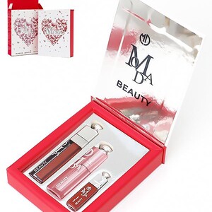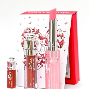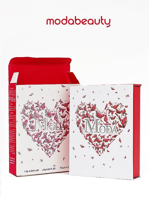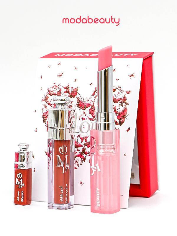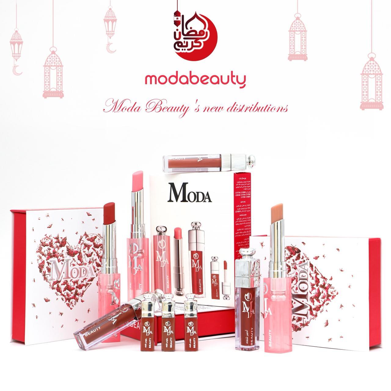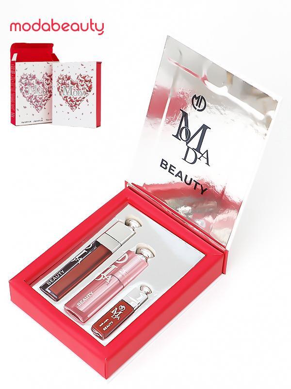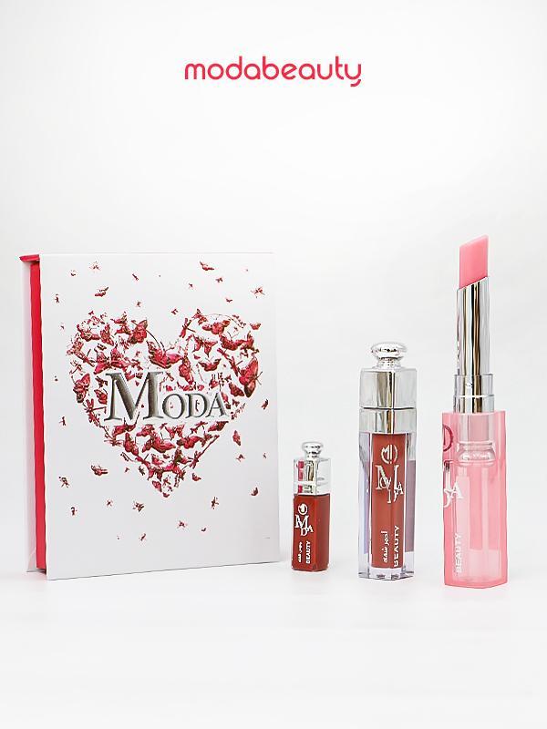 المنتج هو مجموعة أحمر شفاه من ماركة “مودا بيوتي” (modabeauty). تحتوي المجموعة تحتوي على ثلاثة أشياء ،،، روج -مرطب-قلوس -بدرجات مختلفة . تأتي المجموعة في علبة حمراء أنيقة مع غطاء شفاف يحمل شعار “مودا بيوتي”. وتستخدم هذه الاشياء لإظهار الشفه بلمعان وطوبه وشكل أنيق وجذاب،،،،