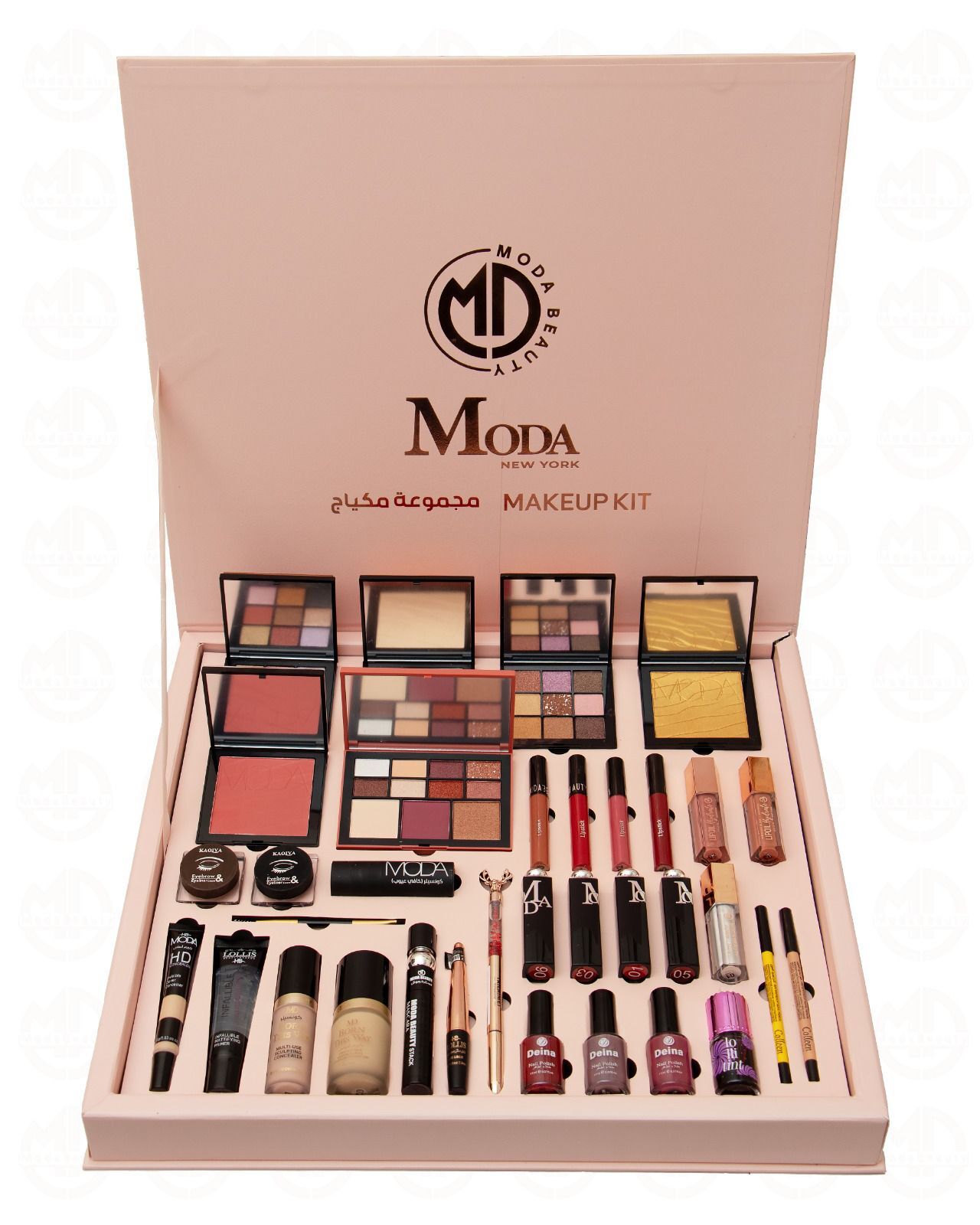 الترابية، الدافئة، والمشرقة لتناسب الإطلالات اليومية والمناسبات الخاصة. . . بلاشرات وهايلايترات تمنحك إشراقة طبيعية وتحديد مثالي لملامح الوجه. . مجموعة أحمر الشفاه بألوان أنثوية جذابة من النيود إلى الأحمر الكلاسيكي. . . ملمعات الشفاه وأحمر شفاه سائل بتركيبة ناعمة وثبات طويل. . . أقلام تحديد العيون والحواجب الرسمة دقيقة وإطلالة عيون مثالية. . ماسكارا كثيفة تضيف لرموشك طولا وكثافة ساحرة. . . طلاء أظافر بألوان عصرية تضفي لمسة أنيقة على أطرافك. . . كريم أساس وبرايمر تثبيت المكياج لتغطية مثالية وثبات يدوم طوال اليوم. . مميزات البوكس – تصميم أنيق بلون وردي فاخر مع لمسات ذهبية جذابة. . . يحتوي على 34 قطعة متنوعة تغنيك عن شراء أي إضافات. . . مثالي للسفر، الهدايا، أو للاستخدام الشخصي اليومي. . يناسب جميع مستويات الخبرة في المكياج – من المبتدئات إلى المحترفات. . بوكس مودا بيوتي الجديد هو خيارك الأمثل لتتألقي بثقة وجمال في كل لحظة