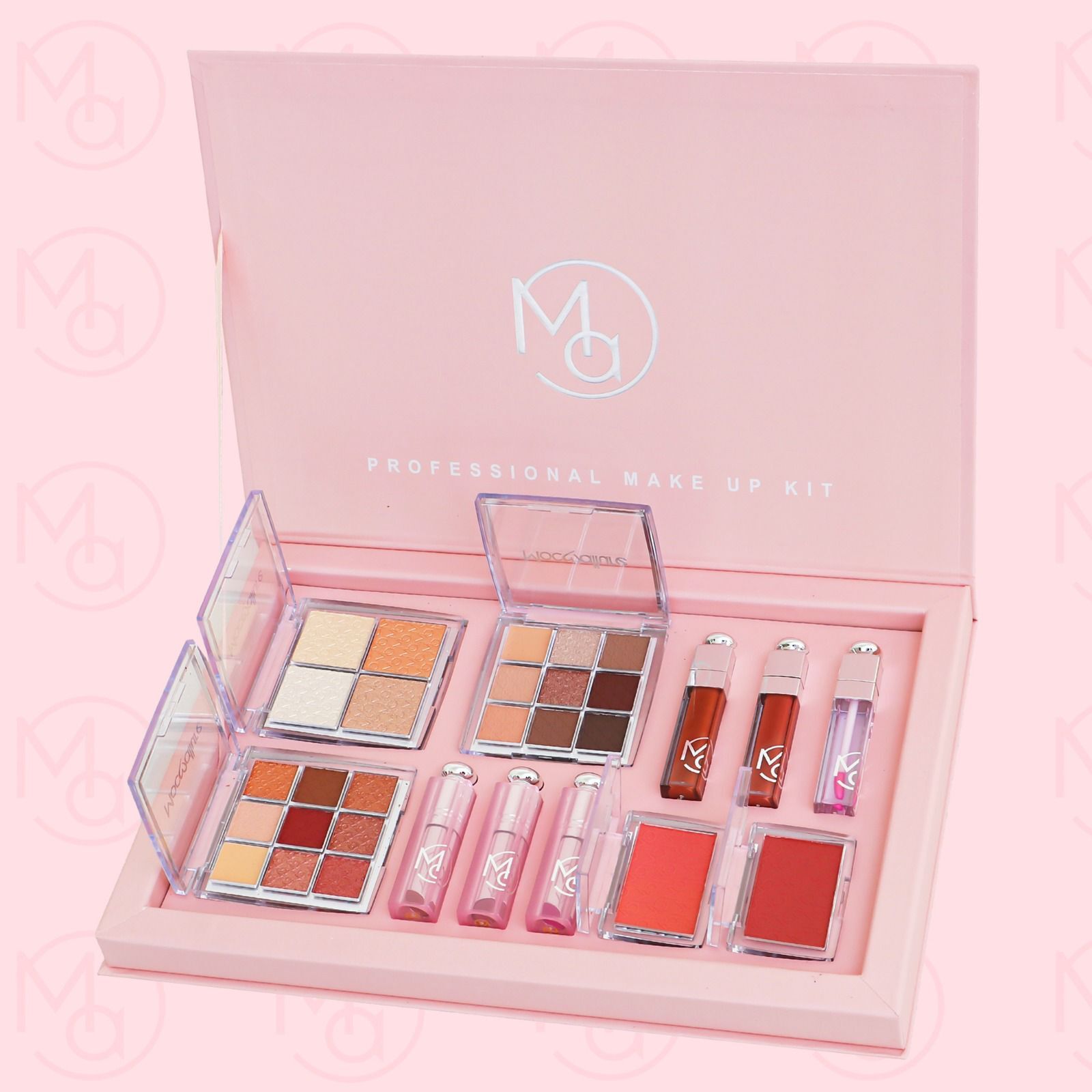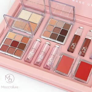 - مجموعة احترافية متكاملة تضم ظلال عيون، أحمر شفاه، ملمعات، بلاشرات، وإضاءات بتركيبات عالية الجودة.