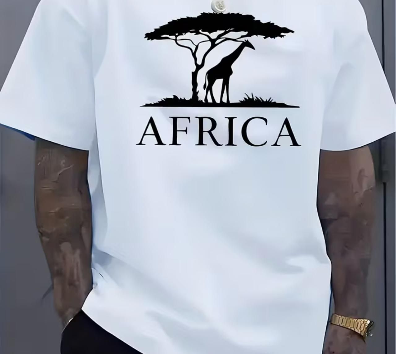 تصميم أنيق يجمع بين شجرة السافانا الشهيرة وظل الزرافة في مشهد يعكس الهدوء والقوة، مع كلمة AFRICA بخط كلاسيكي جذاب.