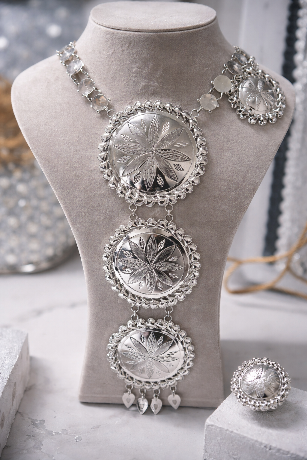 طقم فضي تراثي بتصميم دائري مستوحى من الزخارف العربية الأصيلة، يجمع بين البساطة والقوة في آنٍ واحد 🤍