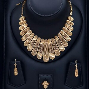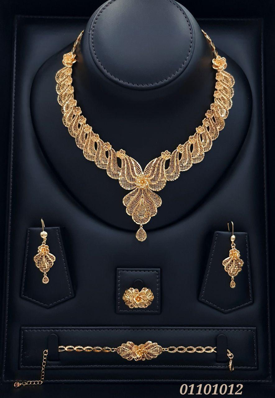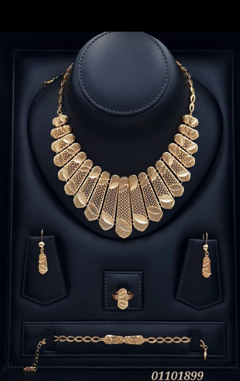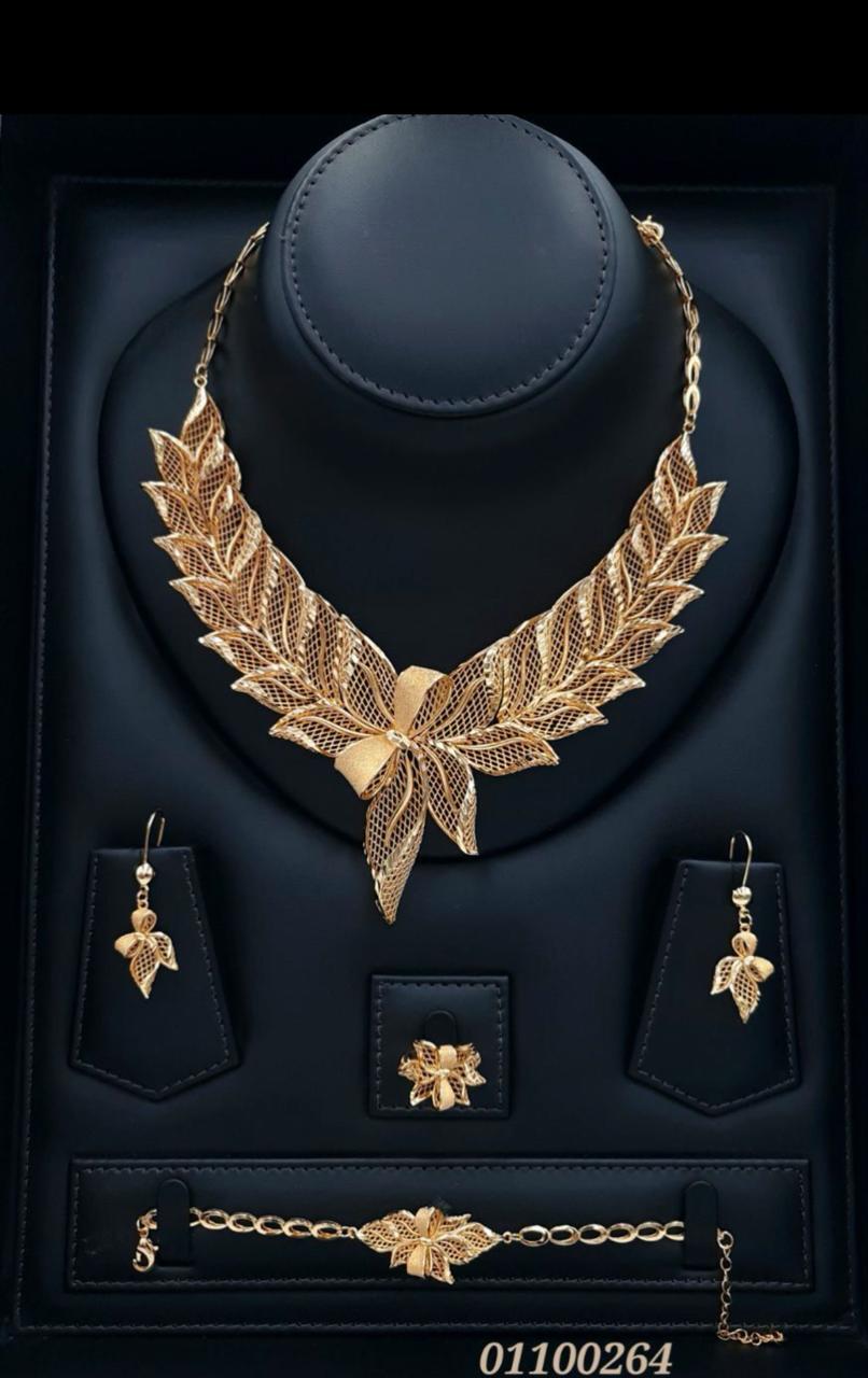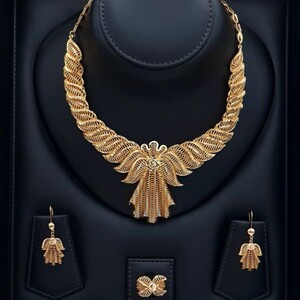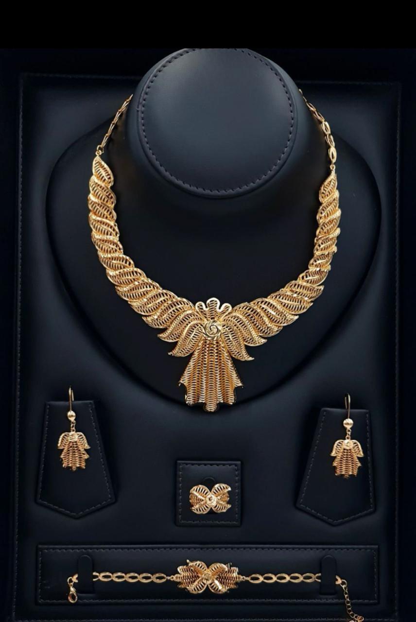 قطعة استثنائية صُمّمت لتجسّد أناقة لا تُشبه سواها. طقم مطلي بالذهب بلمسة فنية راقية، يتميّز بتفاصيل متشابكة دقيقة تعكس حرفية عالية وبريقًا ناعمًا يمنح إحساس الفخامة من أول نظرة.