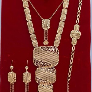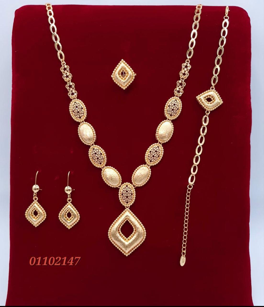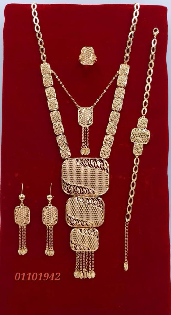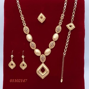 طقم مجوهرات مطلي بالذهب بتصميم استثنائي يحاكي بريق القطع الملكية. تفاصيل دقيقة، لمعة راقية، وانسجام مثالي يمنحك حضورًا أنيقًا يلفت الأنظار من اللحظة الأولى.