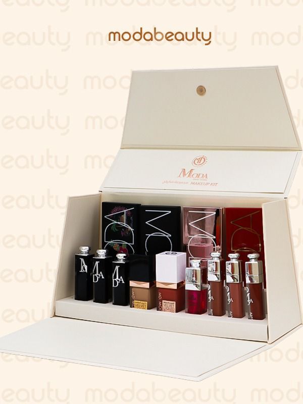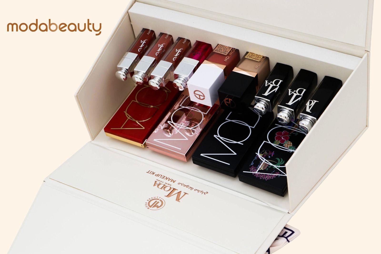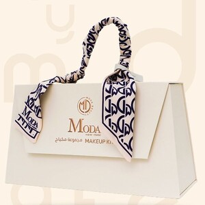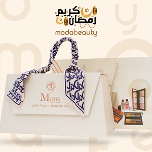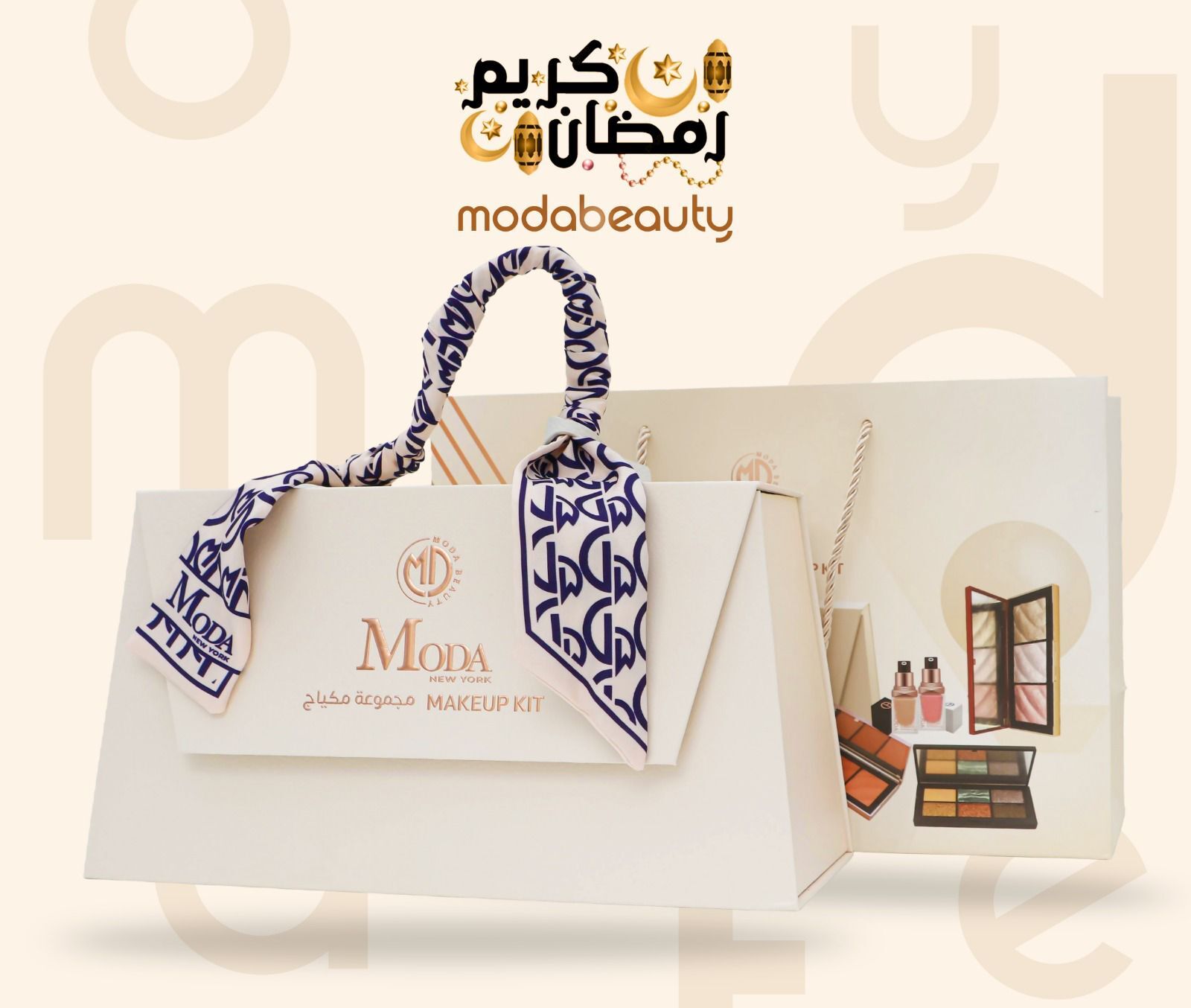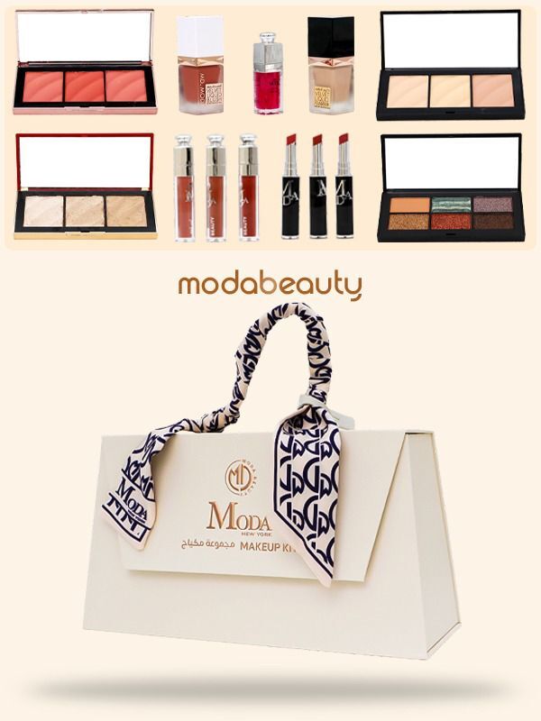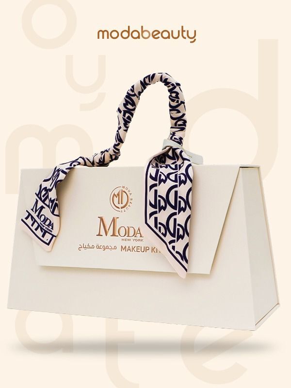 بكس اللي في الصورة هو مجموعة مكياج من ماركة مودا بيوتي (modabeauty) تحت اسم “مجموعة مكياج” (MAKEUP KIT). البكس يحتوي على تشكيلة متنوعة من منتجات المكياج تشمل: